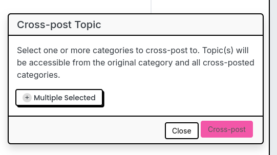 Additionally, NodeBB doesn't have the concept of "boosting" (also known as resharing, reblogging, etc.) It does do something similar when topics are moved between categories, and so it would make sense that a cross-post would be the forum equivalent of a reshare.