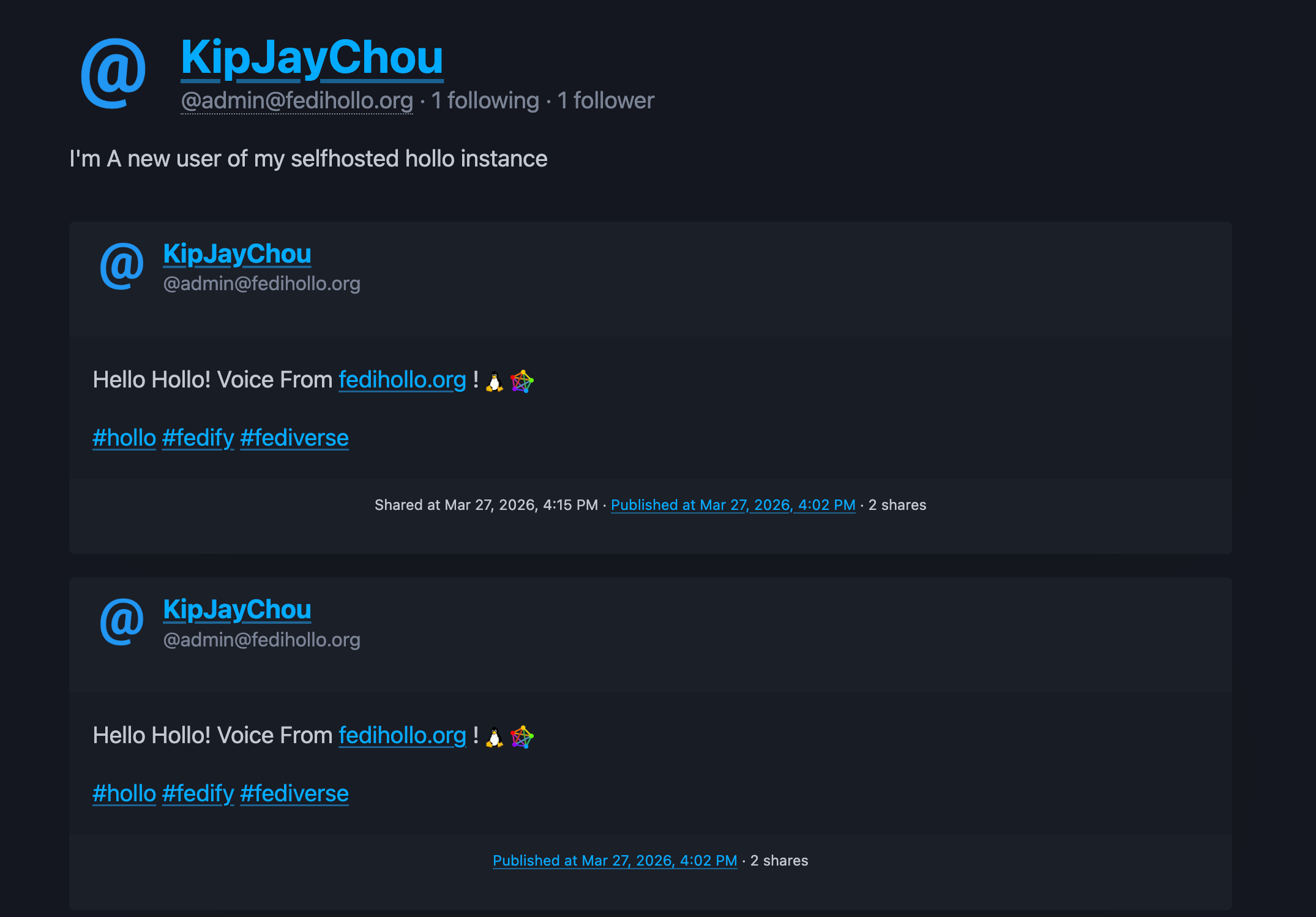 而hollo,应该是一个管理员,可以创建多个账户,比如这个@admin@fedihollo.org ,还可以创建 @xxx@fedihollo.org ;