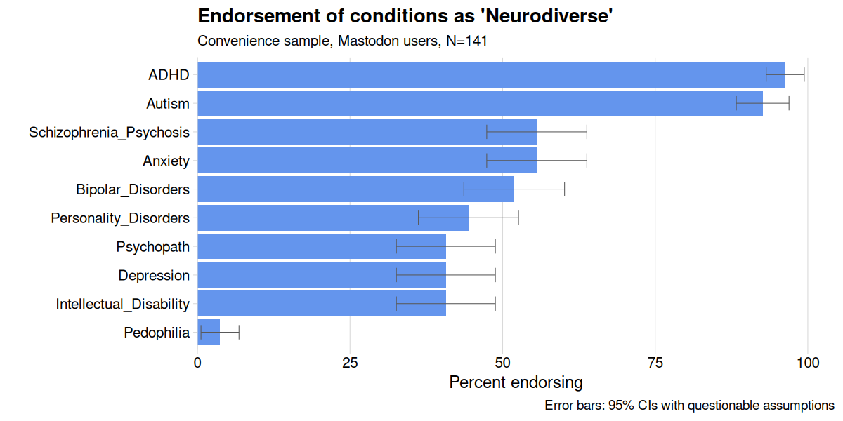 I did a poll here for a week. 141 people responded. I was interested in #mastodon users' preferred categorization of the term "neurodiverse." The results generally confirmed my a priori predictions but had some surprises. Some takeaways for me, right now: