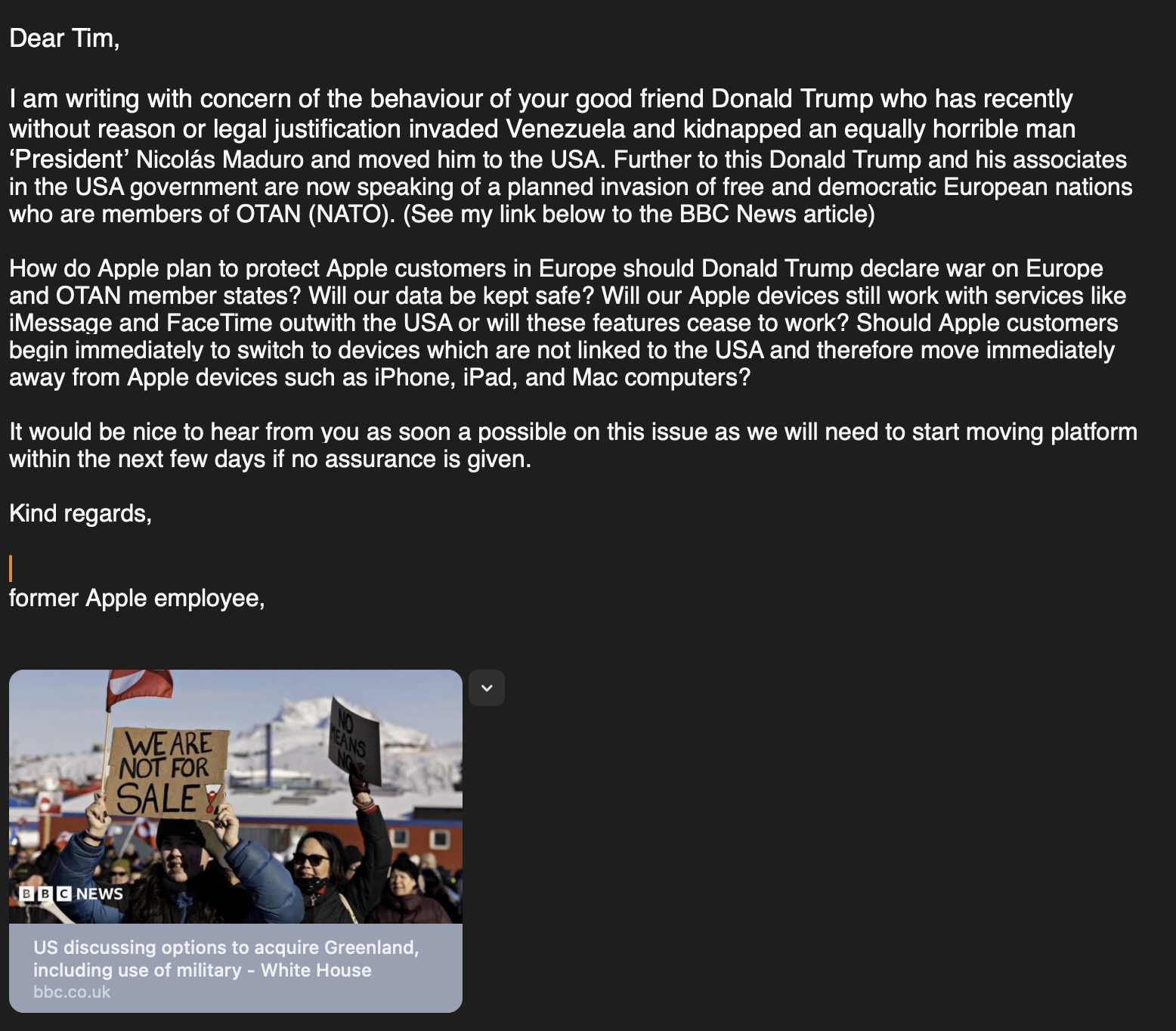 Just wrote a wee email to Tim Cook at Apple asking if Europeans should switch away from Apple devices since Trump is threatening a war on Europe. #TimCook #Apple #Trump #DonaldTrump #Greenland #Venezuela #NicolasMaduro