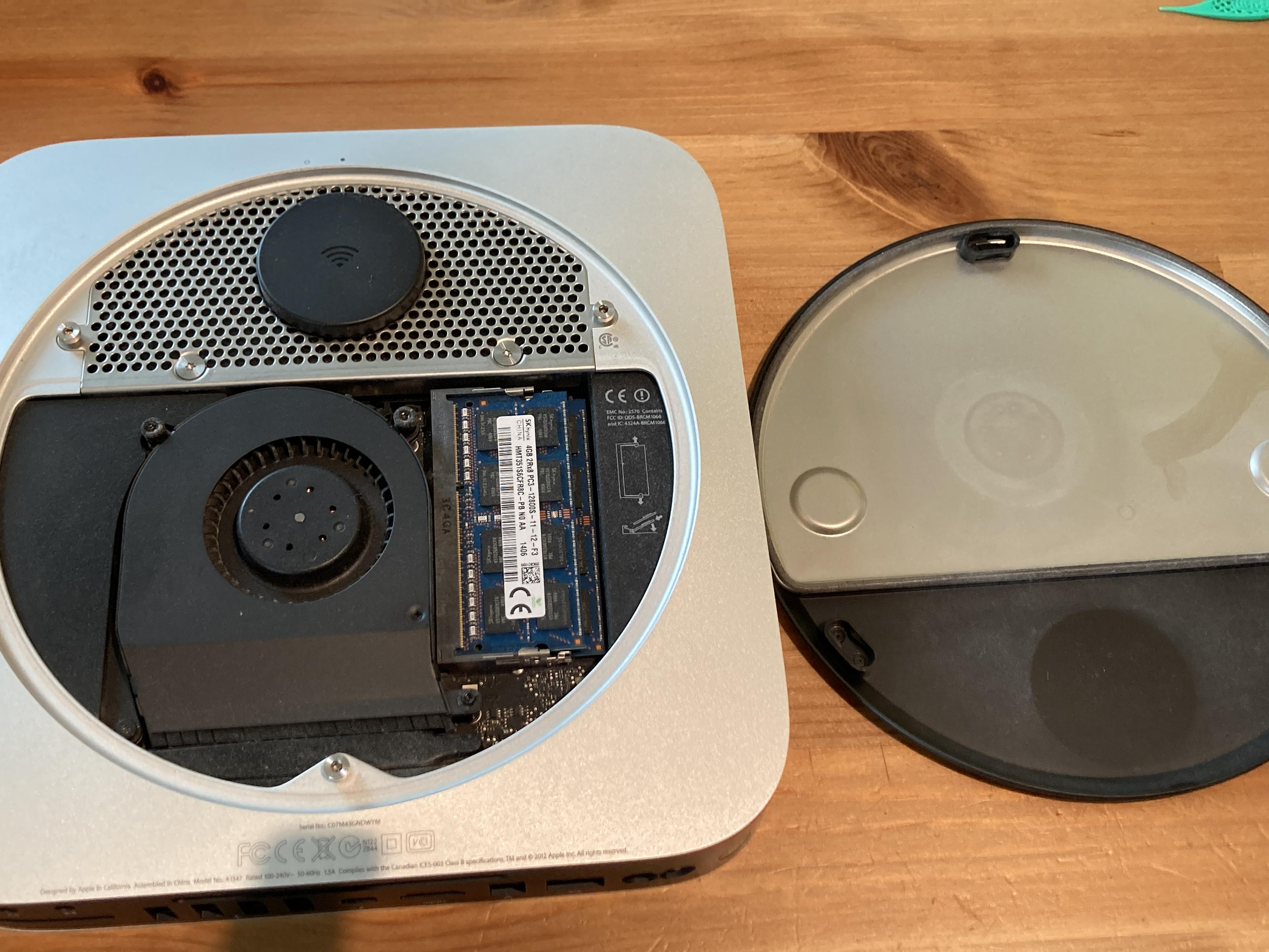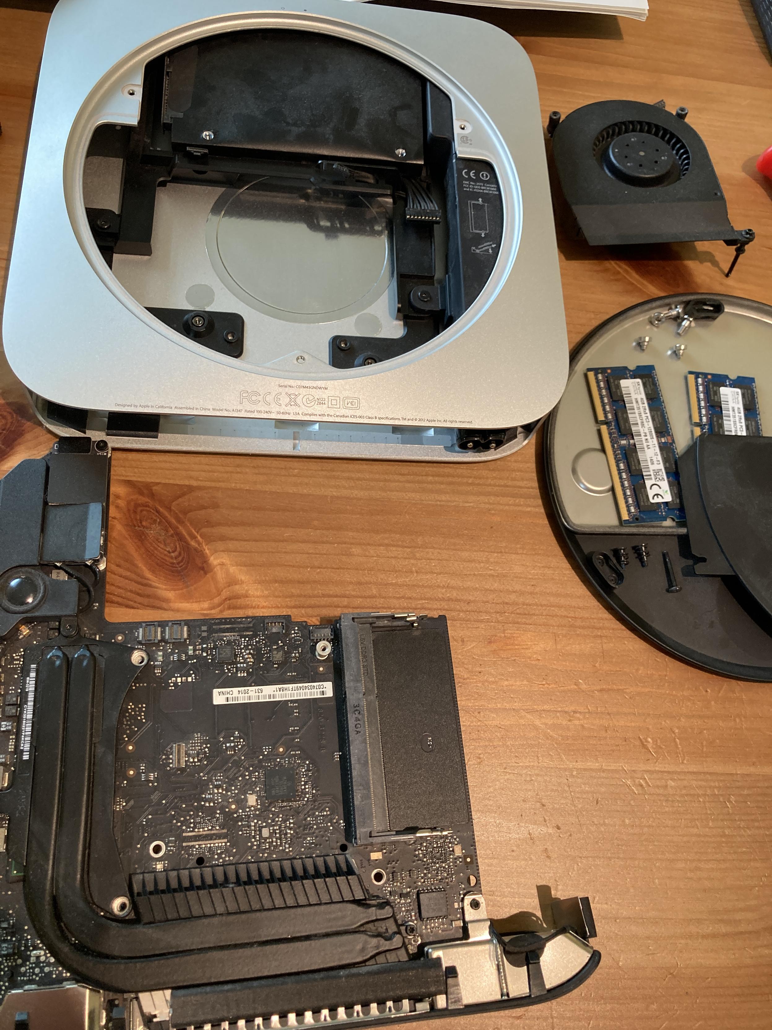 less well known is that the late 2012 mac mini is the last of its series to have upgradeable SATA drives and RAM modules. it takes about 2 minutes to fully disassemble the machine - despite having a rather goofy internal design. it has room for *two* 2.5" sata drives, and the logic board has two sata ports. (by 2014, apple got rid of the two sata bays, and soldered ram to the logic board)