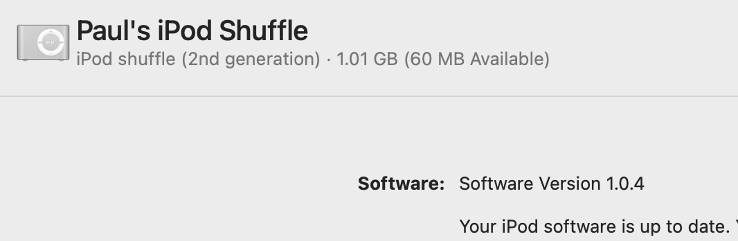 Found a couple iPod Shuffles in a box. Plug them in (yes, I had one charge/sync cable!), wait 5 minutes to get some charge on the battery, and Shazam, one GIG of capacity in all its glory.