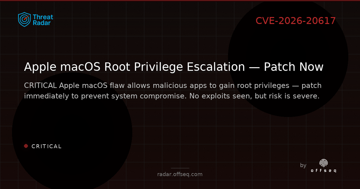 🚨 CVE-2026-20617 (CRITICAL): Race condition lets malicious apps escalate to root on macOS & Apple OS. No exploits in the wild yet — patch to Sonoma 14.8.4, Tahoe 26.3 ASAP! https://radar.offseq.com/threat/cve-2026-20617-an-app-may-be-able-to-gain-root-pri-42394d40 #OffSeq #macOS #Apple #Infosec #CVE202620617