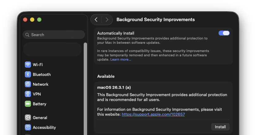 #Apple sure has hidden the "Background Security Improvement" well: You can find it from Settings > Privacy & Security > Background Security Improvements