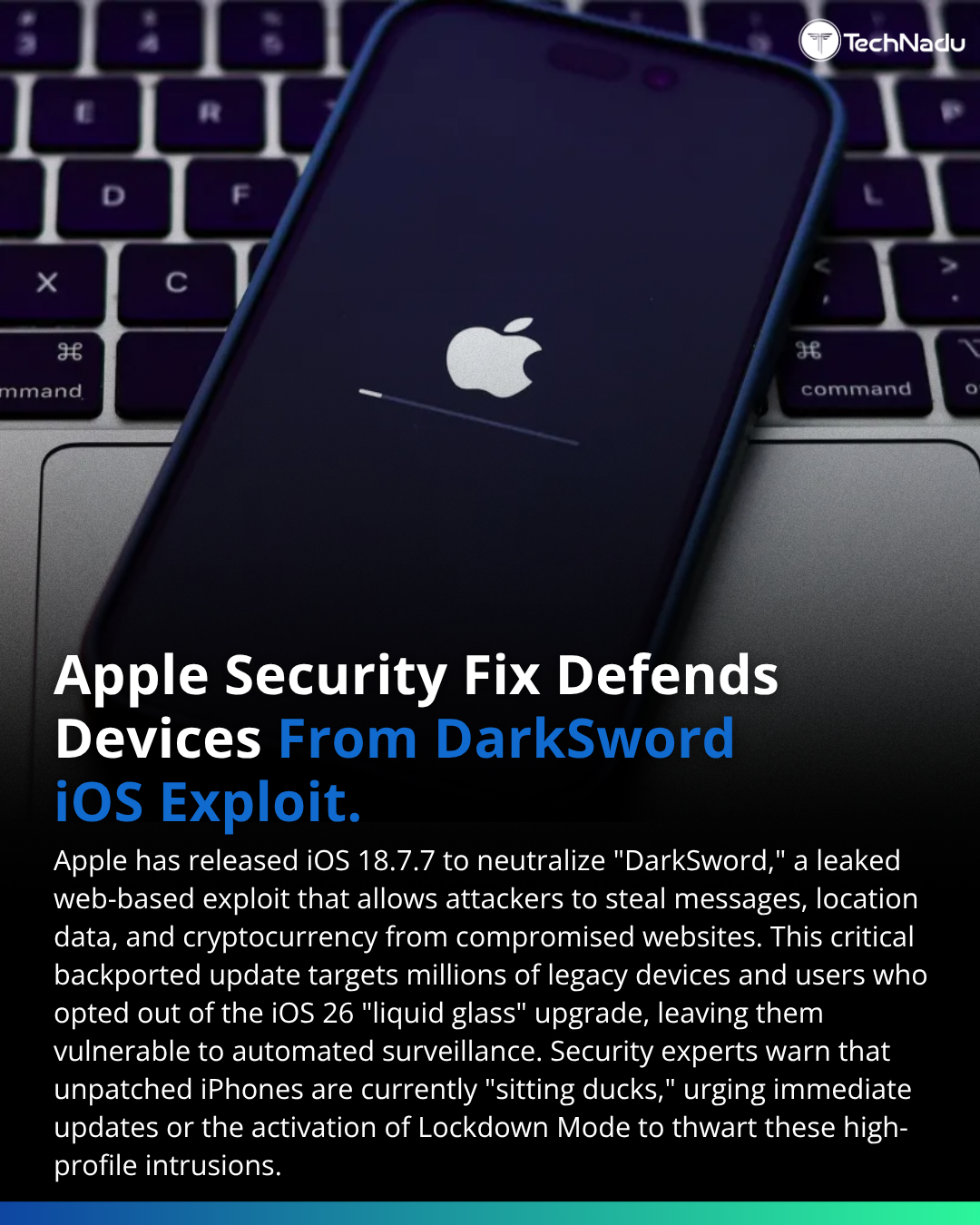 Apple expanded iOS 18.7.7 to cover all devices from iPhone XR through iPhone 16, protecting against the DarkSword exploit kit that uses multiple zero-days for one-click browser compromise. The update initially only covered 4 older models. Apples doing something rare—backporting security patches across the entire supported device range. When Apple backports to every supported device, the threat is serious enough to break their own update policy.