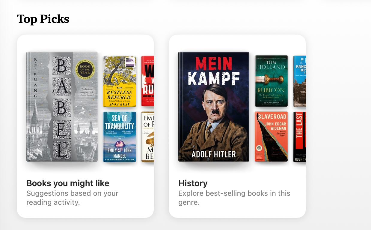 Slightly disturbing Top Picks list in the Apple Books store. Let's hope that it at least is some heavily annotated and footnoted critical edition. Hmm, at €0.99, maybe not, probably just the original in am equally old translation, which now is out of copyright? (And no, I am not going to download a sample to check, thus increasing its visibility even more.) Seriously, what the actual fuck, Apple
