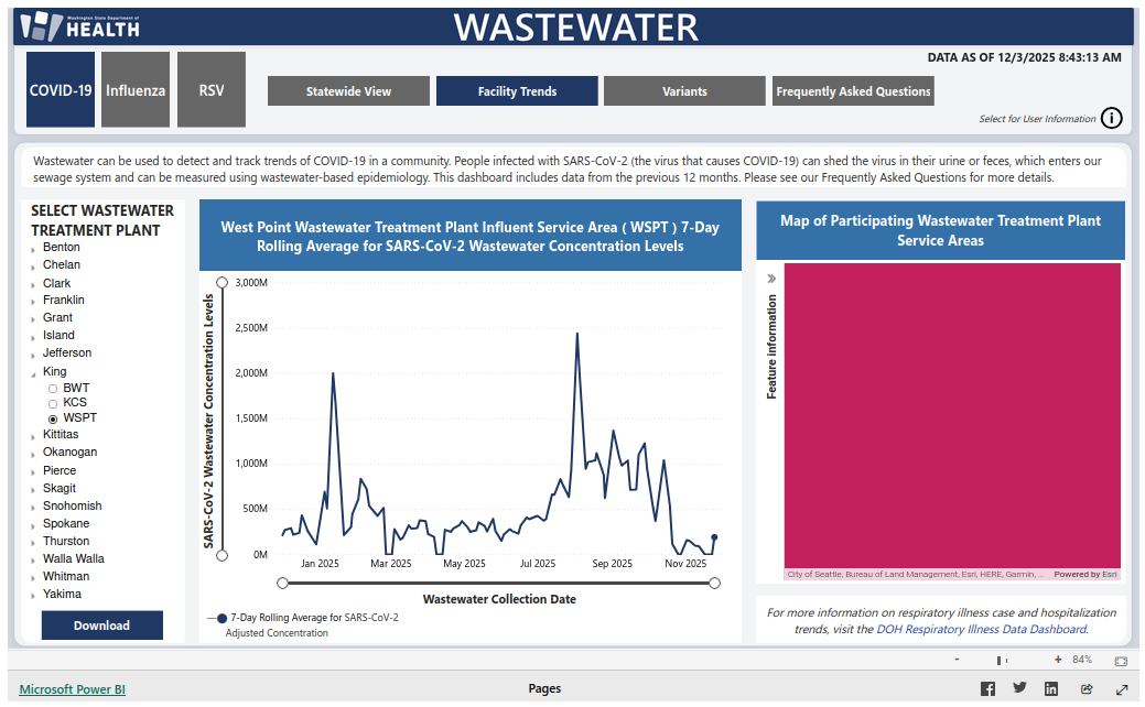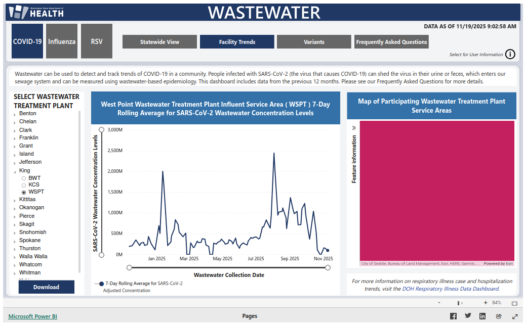 WSPT is one of three King County(-ish) sewersheds in this dataset. You can find overviews, individual sewershed results, and a breakdown of variants for the state wastewater surveillance program, along with other metrics like case counts and hospitalizations for Covid-19 and other respiratory illnesses, at https://doh.wa.gov/data-and-statistical-reports/diseases-and-chronic-conditions/communicable-disease-surveillance-data/respiratory-illness-data-dashboard#WasteWater. If you go to the page and click "learn more" in the statewide view tab, you can find out lots of details about how these data are calculated and how to interpret them. The dashboard gets updated every Wednesday (generally). The Department of Health is here on the fediweb, at @WADeptHealth