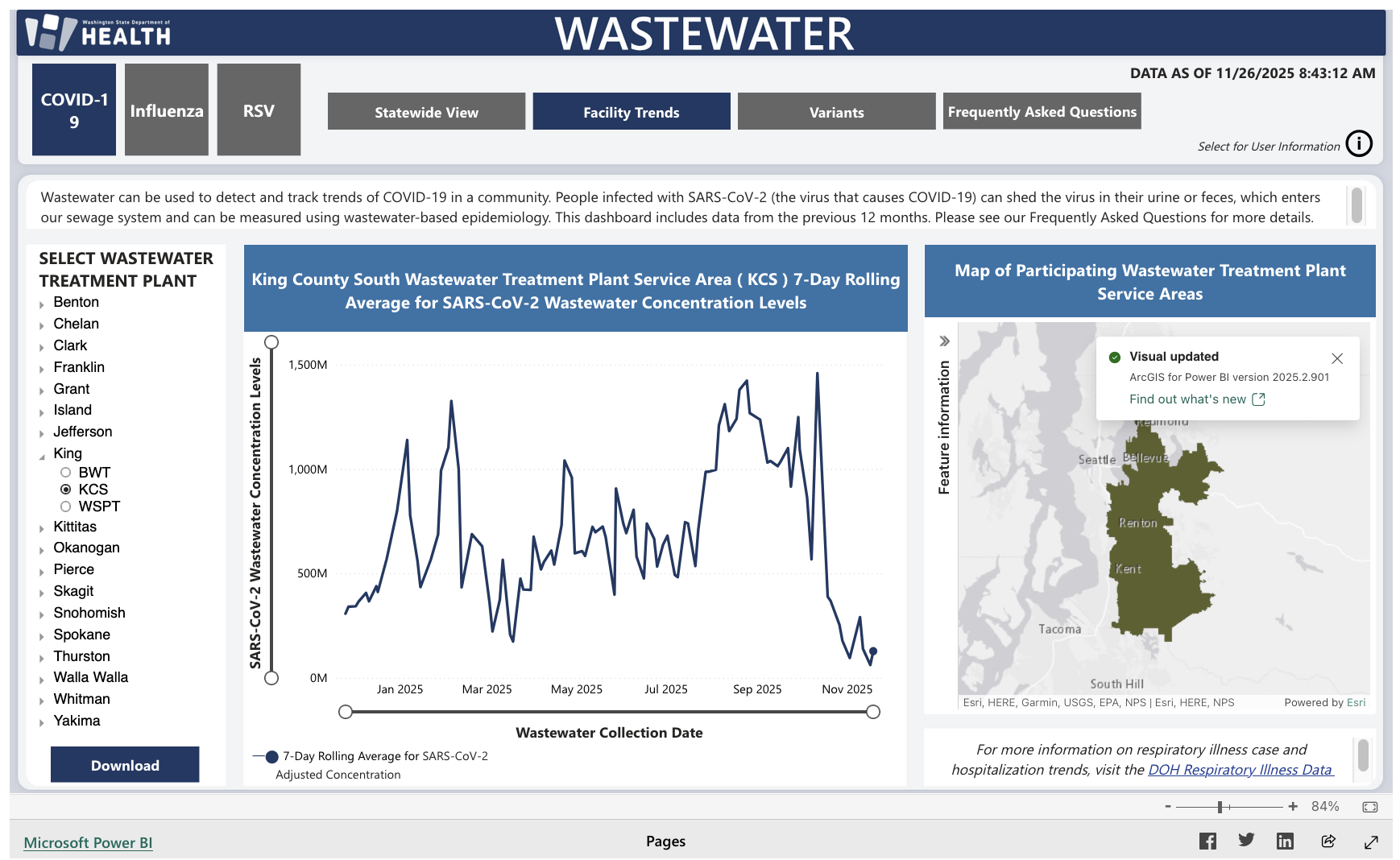 There are three King County(-ish) sewersheds in this dataset. You can find overviews, individual sewershed results, and a breakdown of variants for the state wastewater surveillance program, along with other metrics like case counts and hospitalizations for Covid-19 and other respiratory illnesses, at doh.wa.gov/data-and-statistica. If you go to the page and click "learn more" in the statewide view tab, you can find out lots of details about how these data are calculated and how to interpret them. The dashboard gets updated every Wednesday (generally). The Department of Health is here on the fediweb, at @WADeptHealth