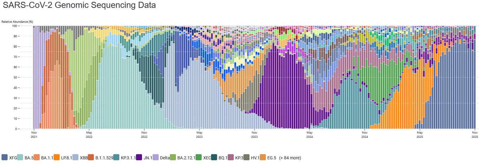 Both the West Point (WSPT) and Brightwater (BWT) sewage treatment plants had placeholder 0.0 values this week, so no new data to report there. But the King County South sewage treatment did report in, and its seven day running average of Sars-Cov2 levels is nice and low. In fact, the 11/17 7DRA is the lowest recorded since fall of 2024, when this dataset began. It has climbed up a bit since then. Last data was calculated on 11/19.
