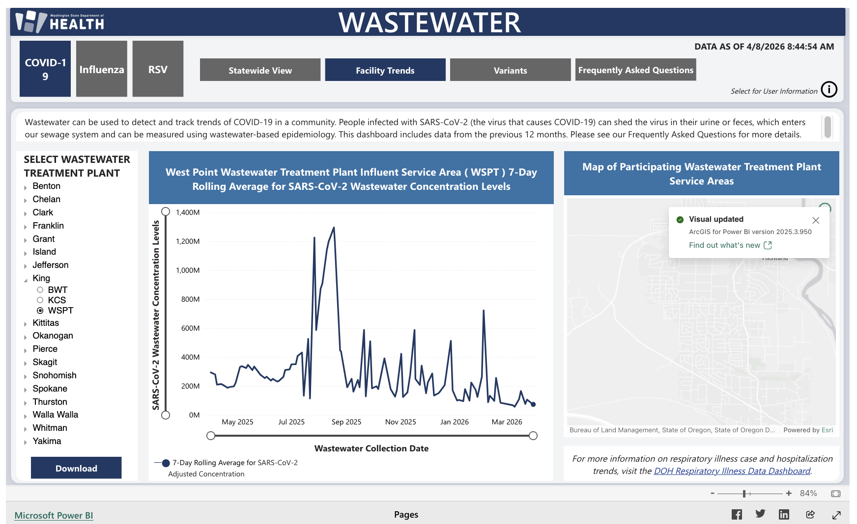 WSPT is one of three King County(-ish) sewersheds in this dataset. You can find overviews, individual sewershed results, and a breakdown of variants for the state wastewater surveillance program, along with other metrics like case counts and hospitalizations for Covid-19 and other respiratory illnesses, at doh.wa.gov/data-and-statistica. If you go to the page and click "learn more" in the statewide view tab, you can find out lots of details about how these data are calculated and how to interpret them. The dashboard gets updated every Wednesday (generally). The Department of Health is here on the fediweb, at