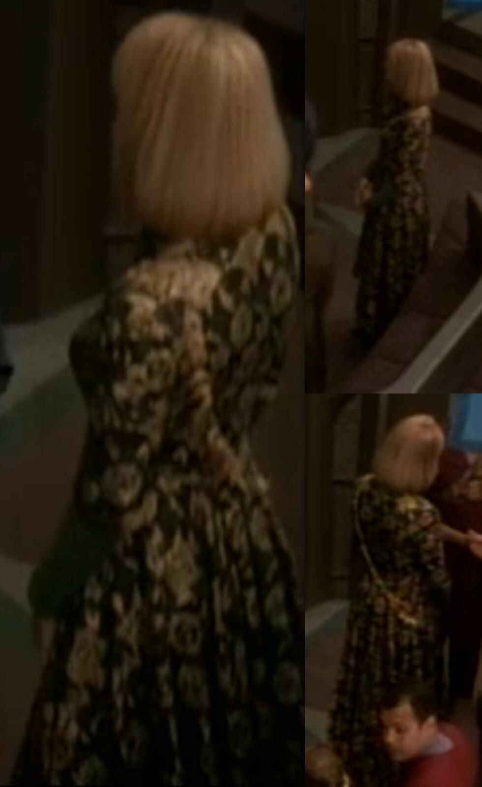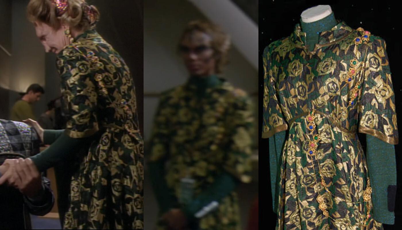 The dress next appeared in late season 4 of #StarTrekDS9 in the episode "The Muse". It is worn by a human civilian, waiting for a friend at a Promenade airlock early in the episode. This is the first of a number of appearances of the costume on #DS9. 3/11