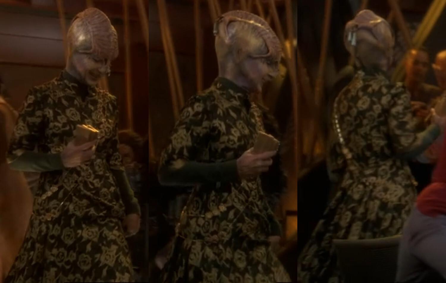 #StarTrekDS9's "In the Cards" next featured a female Peliar Zel II player who just won some latinum at Dabo in Quark's Bar, wearing the lucky green dress. This is the last time the costume is seen on the station but not the final #DS9 appearance. 5/11