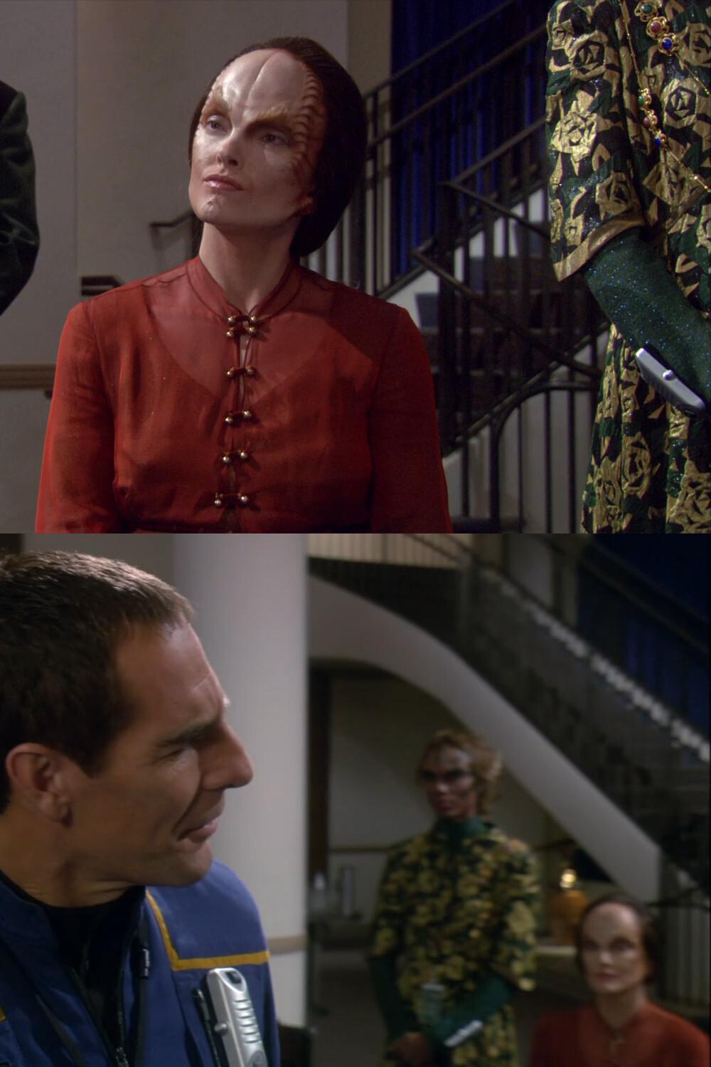 Thanks to the dress, we know that the close-up of the Denobulan ambassador in #StarTrekENT's "Terra Prime"⬆️ (compare the other shots ⬇️) is flipped horizontally (1st pic). We also find out that the dark sleeve velcro patch (not present in #DS9⬅️) was added as late as #ENT⬆️➡️) for the universal translator (2nd pic). 10/11