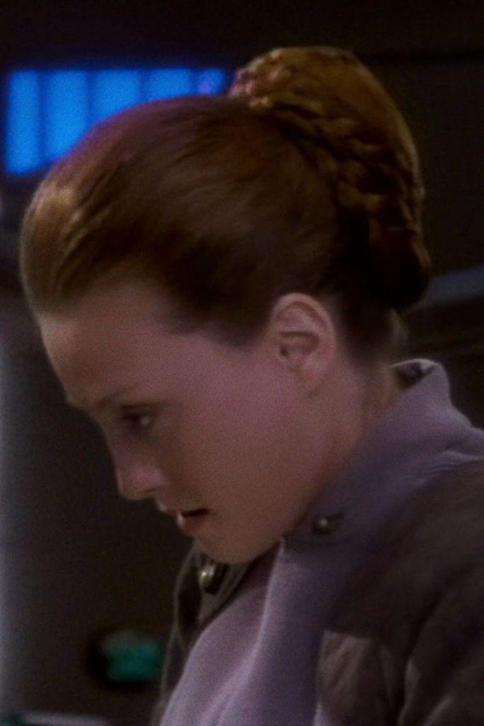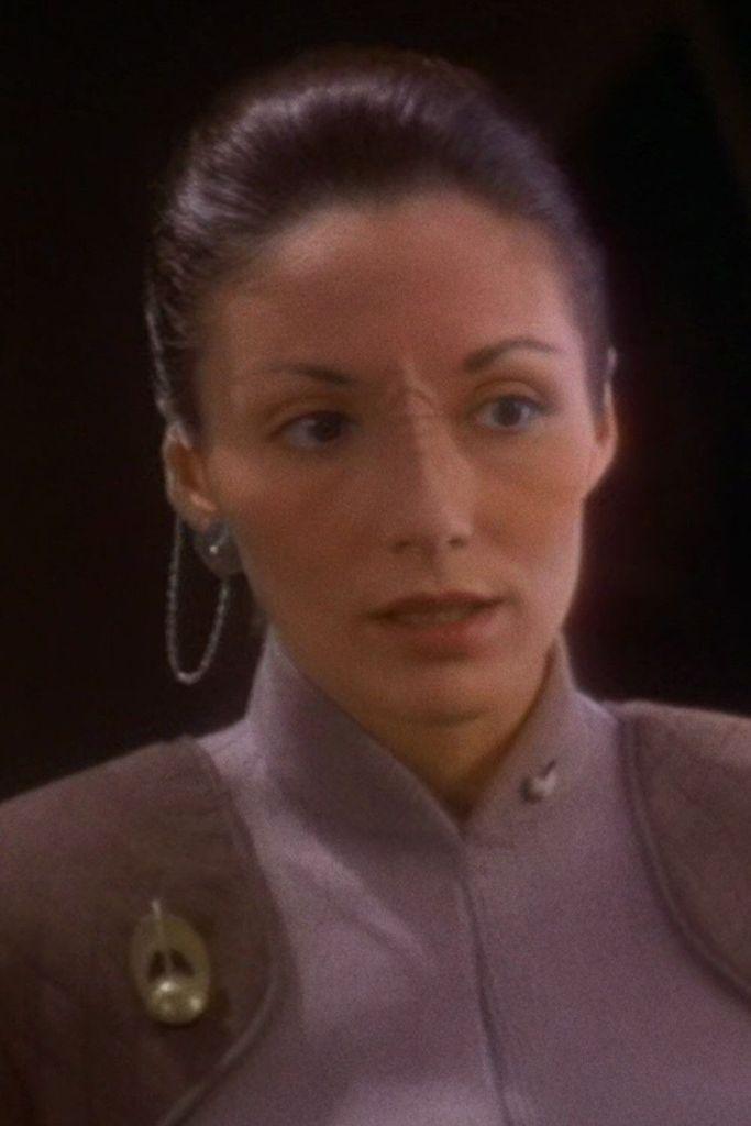 #StarTrekDS9's "The Forsaken" is the first episode in which we see the Bajoran ensign rank insignia, worn by Anara. It consists of the circle, a shortened pin and (the right) half of the inner oval. This will be seen again in later season 1 #DS9 episodes.