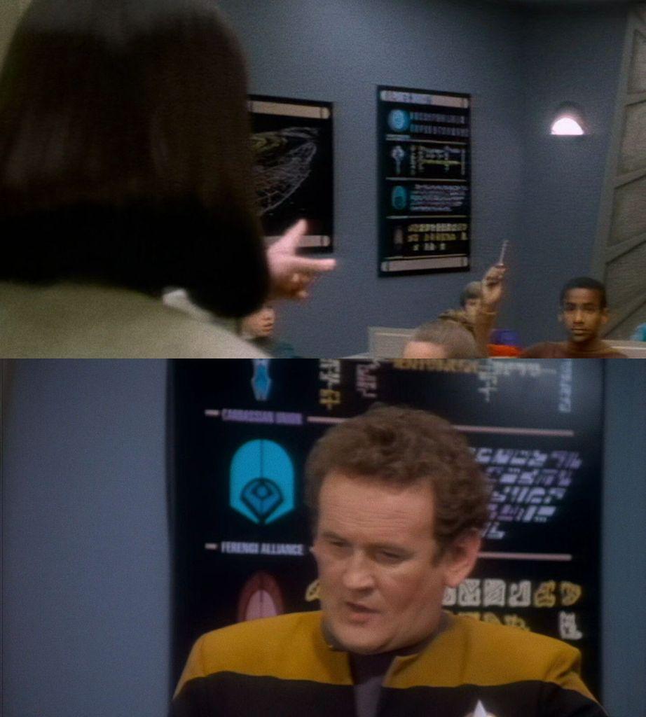 The poster with alien alphabets is seen again in the classroom on #DS9 in #StarTrekDS9's "In the Hands of the Prophets"⬆️. Just like in "The Nagus"⬇️, the Bajoran emblem cannot be fully seen. This will be rectified when the poster appears again in "Cardassians". I'll get there! :-)