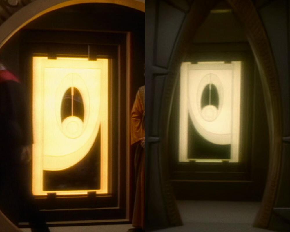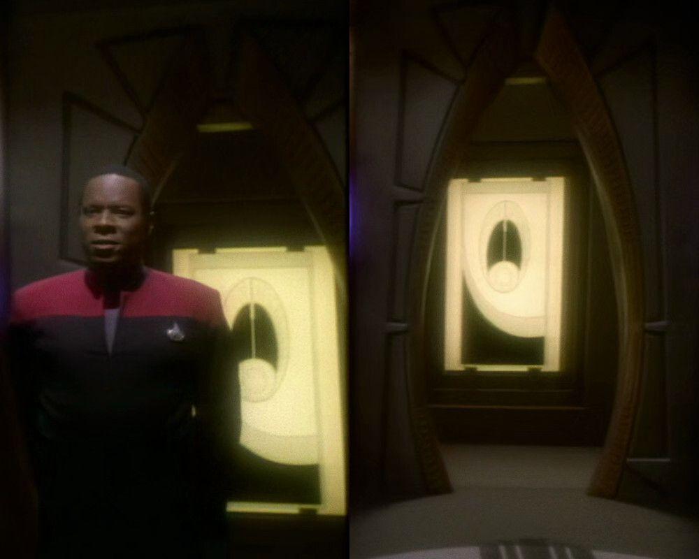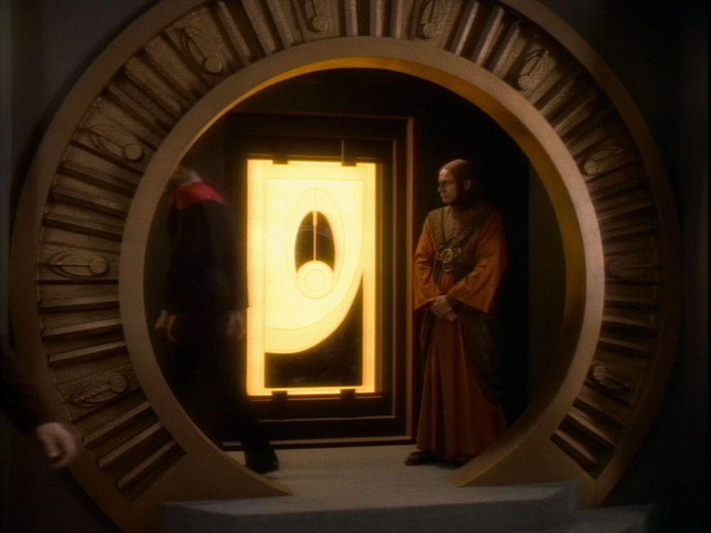We get out best look at yet at the season 1 (plus first third of season 2) Bajoran temple entrance on #DS9 in #StarTrekDS9's "In the Hands of the Prophets". As usual, the Bajoran emblem is so brightly back-illuminated that some of the details cannot be made out.