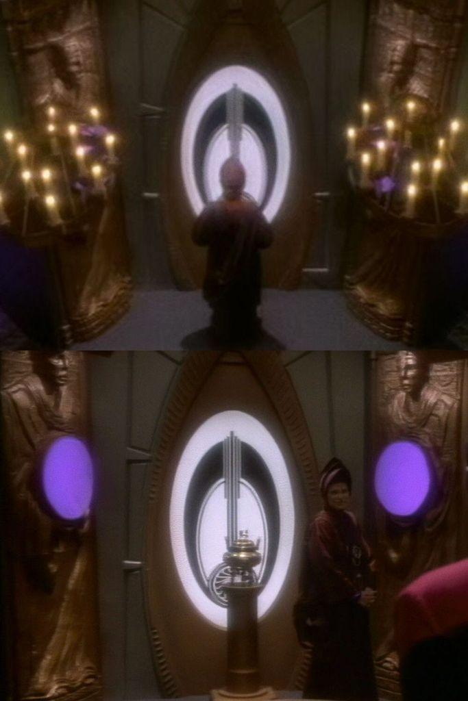 #StarTrekDS9's "In the Hands of the Prophets" is the only episode in which the asymmetrical illuminated Bajoran emblem from season 1 / early season 2 is seen from the outside ⬅️ and the inside ➡️ of the Bajoran temple on #DS9. Logically, it's horizontally flipped.