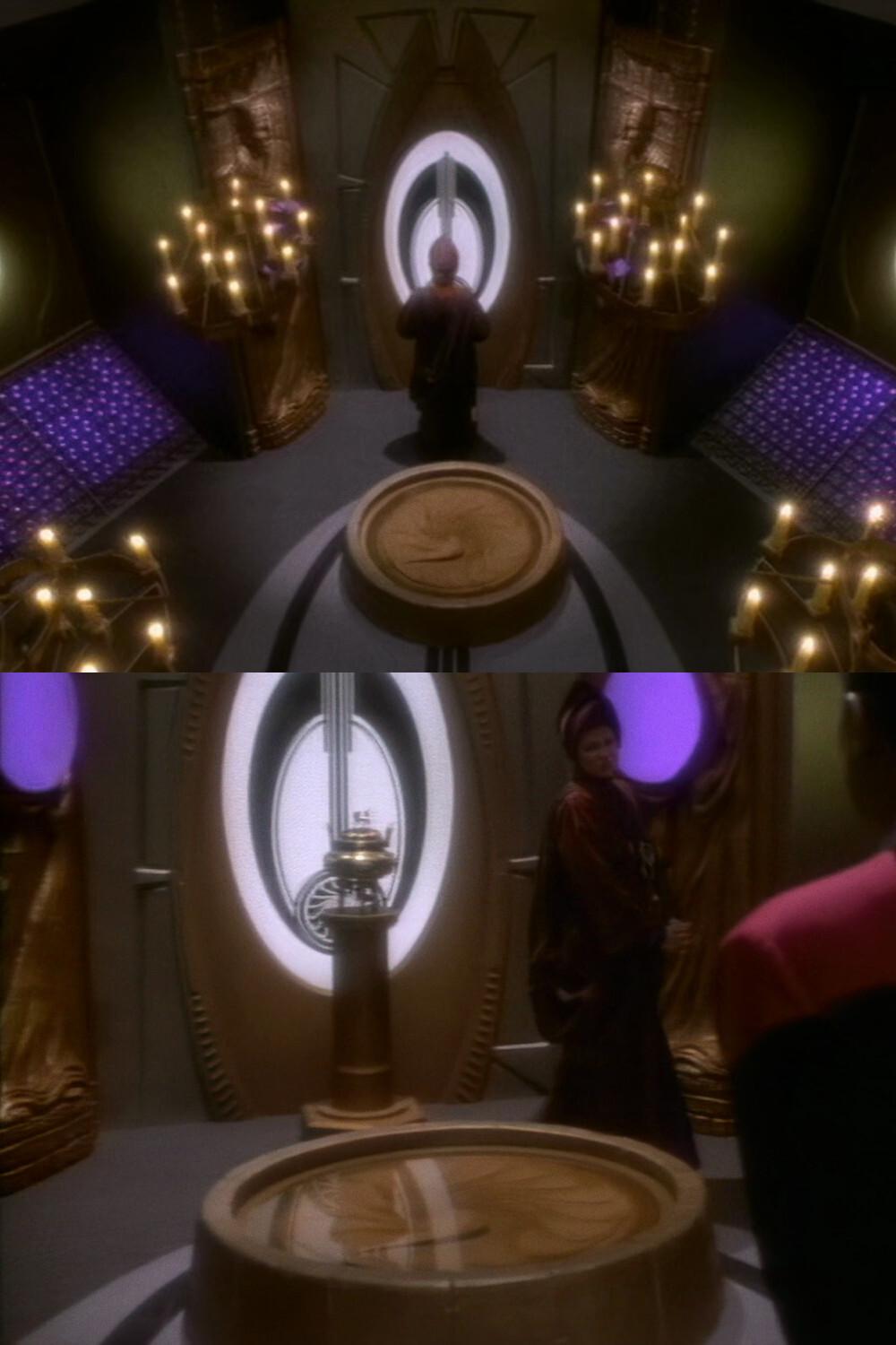 I like how the small circular pool of water in the Bajoran temple on #DS9 in #StarTrekDS9's "In the Hands of the Prophets" forms part of the Bajoran emblem painted on the floor of the temple, namely the circular spiral at the bottom of the emblem. 🧵 1/2