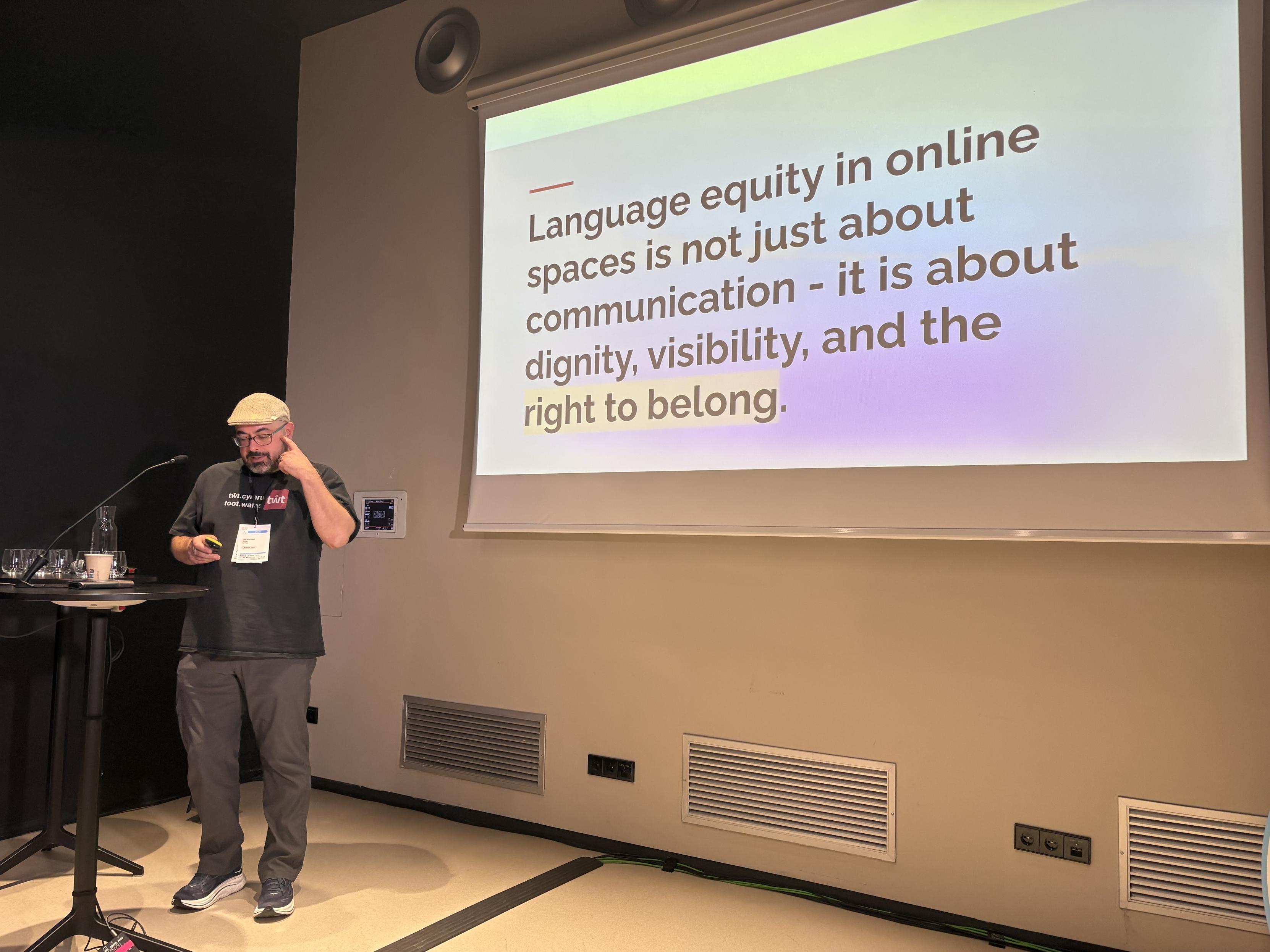 Jaz is explaining the needs for communities online around a particular language, and how he supports the Welsh community with a dedicated server for them in the Fediverse.