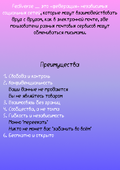 @l создал для вас карточки "Fediverse: что это такое и чем он будет мне полузен". Некоторые люди не знают, что это такое и что там можно делать. Поэтому Лисик решил создать карточки с нашими друзьями из Nazlo.Space. Если вас заинтересует этот (или наш основной) проект, и вдруг что-то пойдёт не так — проверьте статус здесь: Доверяйте только этим трём адресам.