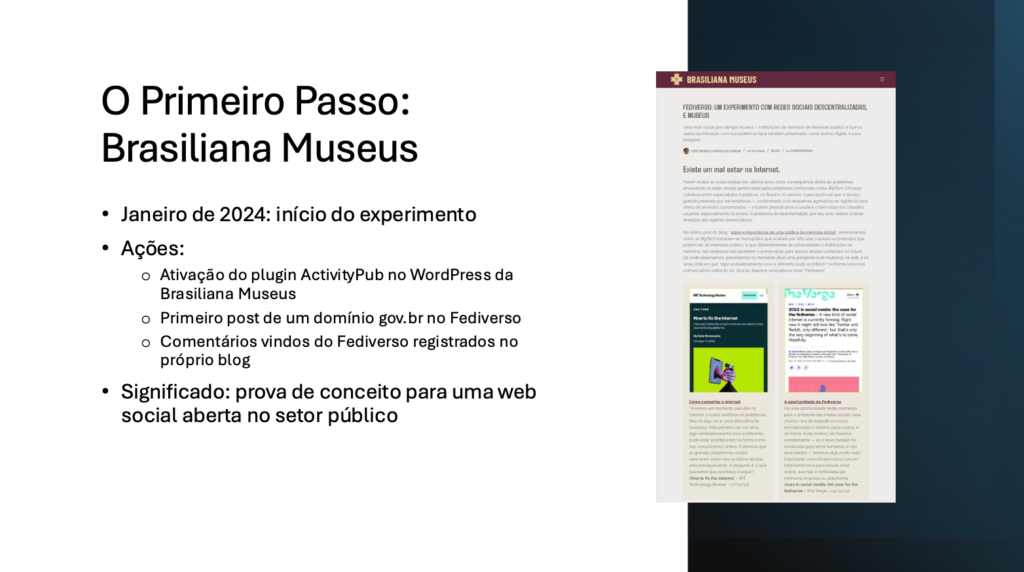 Para inaugurar a iniciativa dos Museus brasileiros no Fediverso, em Jan/2024 nós ativamos o plugin ActivityPub no site WordPress da Brasiliana Museus, e publicamos o primeiro post de um domínio gov.br na websocial, ou seja, no Fediverso. Comentários a este post, originados no Fediverso, foram registrados também na seção de comentários do post no blog da Brasiliana, demonstrando a possibilidade de integração de websites institucionais com o Fediverso.