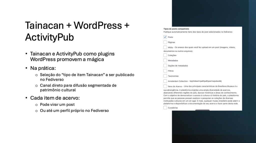 Logo que experimentamos o plugin ActivityPub do WordPress, percebemos como imediatamente podíamos escolher, na interface do plugin (imagem no slide acima), o tipo do post Tainacan que poderíamos selecionar para postagem no Fediverso.