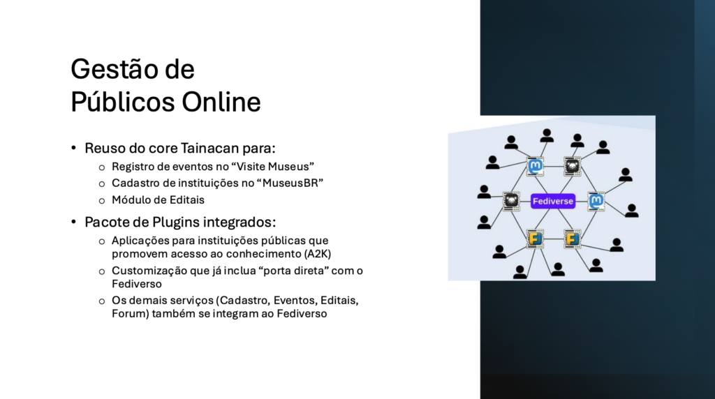 A partir da atuação das equipes de suporte e desenvolvimento do Tainacan no Ibram, viemos adaptando o core da aplicação para o desenvolvimento de outras funcionalidades além da agregação, como o registro de eventos no site “Visite Museus“, e para cadastro de instituições de memória, no serviço “MuseusBR“. Outra iniciativa planejada é o desenvolvimento do módulo de editais que completaria, juntamente com o Tainacan, o que consideramos um pacote de aplicações úteis para instituições públicas. O aspecto mais interessante é que estas novas aplicações, desenvolvidas no âmbito do ecossistema WordPress, da mesma forma como o Tainacan, imediatamente se integram ao Fediverso.