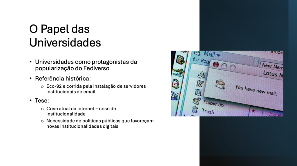 Quando penso no desafio que é deslanchar um estratégia de popularização do Fediverso no Brasil, não posso deixar de pensar nas universidades como instituições melhor posicionadas para o protagonismo. Impossível não lembrar do período de mobilização para a eco-92, onde as universidades entraram em uma competição saudável em termos de diligência na instalação de seus primeiros servidores institucionais de email. Naquele momento, a internet nascia sob os auspícios da institucionalidade.