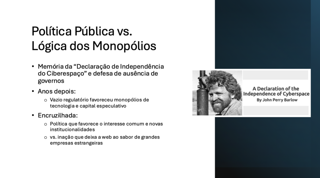 Nos primórdios da Internet, houve uma corrente de ‘hackers’ que advogou a total ausência da atuação de governos no ambiente digital. Isto aconteceu com a publicação da Declaração de Direitos do Ciberespaço (A Declaration of the Independence of Cyberspace). Os últimos 20 anos parecem indicar que a ausência da política pública somente favoreceu a tomada da web pelos interesses do capital especulativo, e dos monopólios transnacionais.
