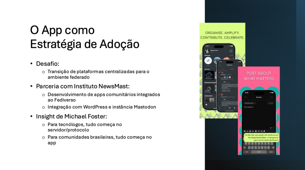 O Michael Foster, idealizador do projeto, costuma dizer que o Fediverso é um ambiente determinado pela tecnologia, onde tudo começa com um servidor, ou mesmo um protocolo. Entretanto, não é assim para as pessoas em geral, ou para as comunidades em geral. Para comunidades e pessoas, especialmente no Brasil, os espaços sociais começam com um app.
