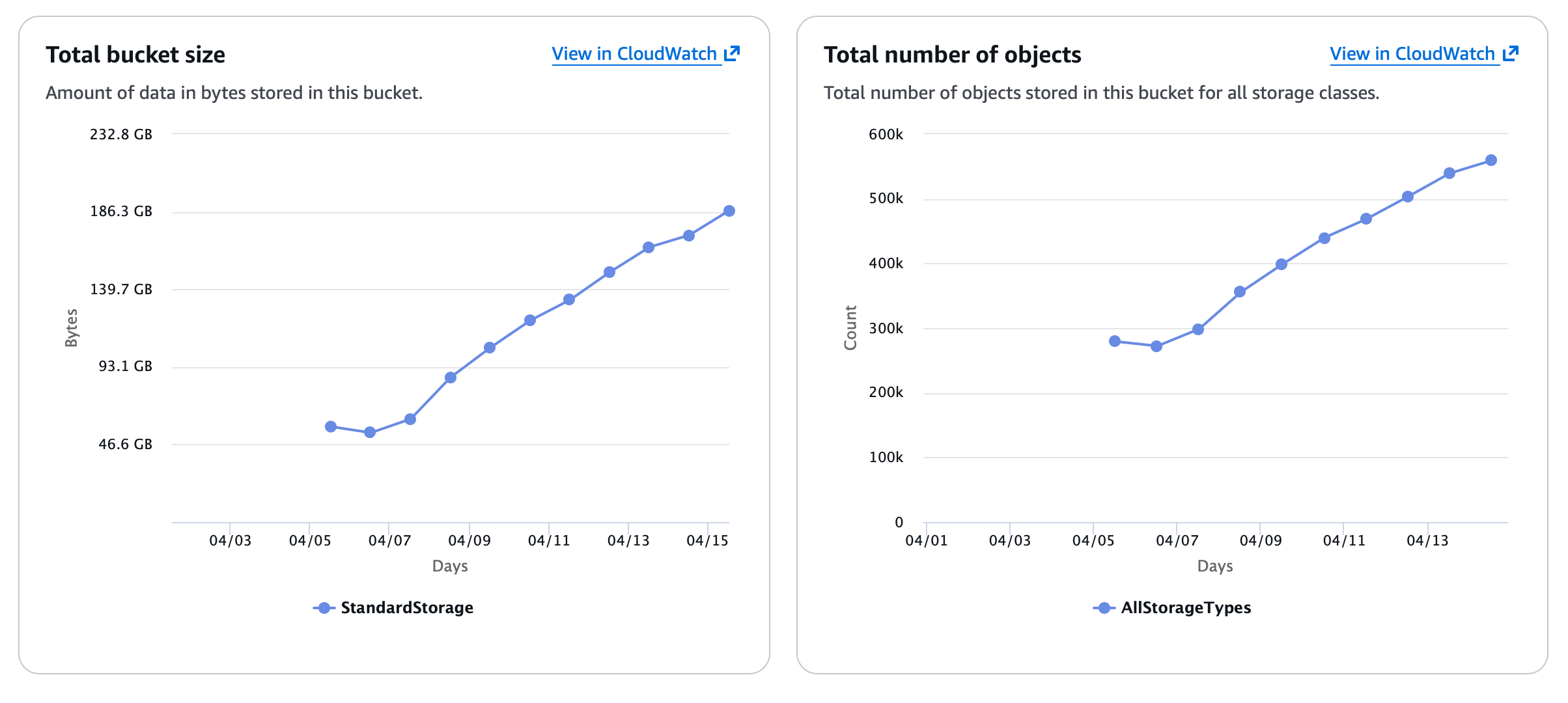 In just 10 days, my S3 bucket for media storage jumped from roughly 50GB to almost 190GB. The total number of objects doubled, going from 280k to over 560k, and the curve is still going up.