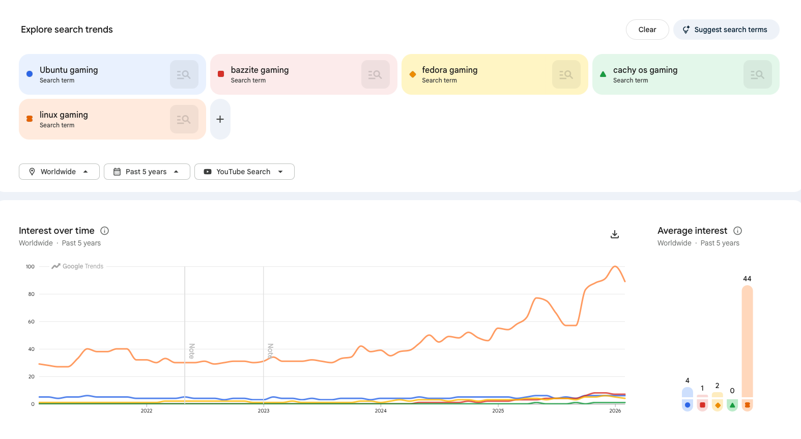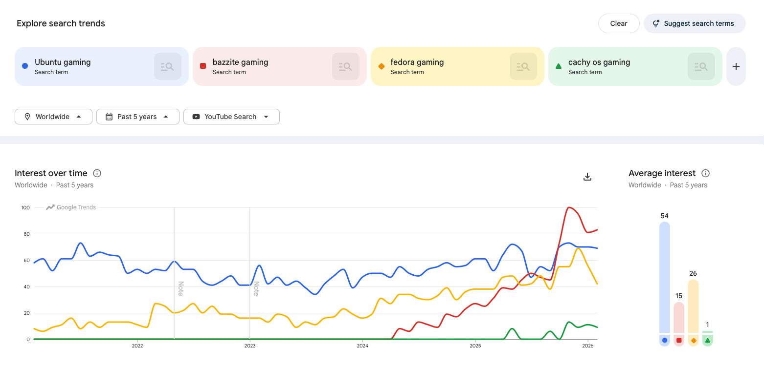 It's nothing short of incredible to see what kind of mindshare Bazzite has attracted in its 3 years of existence. I'm actually surprised to see it eclipsing Ubuntu here, in terms of YouTube search volume.