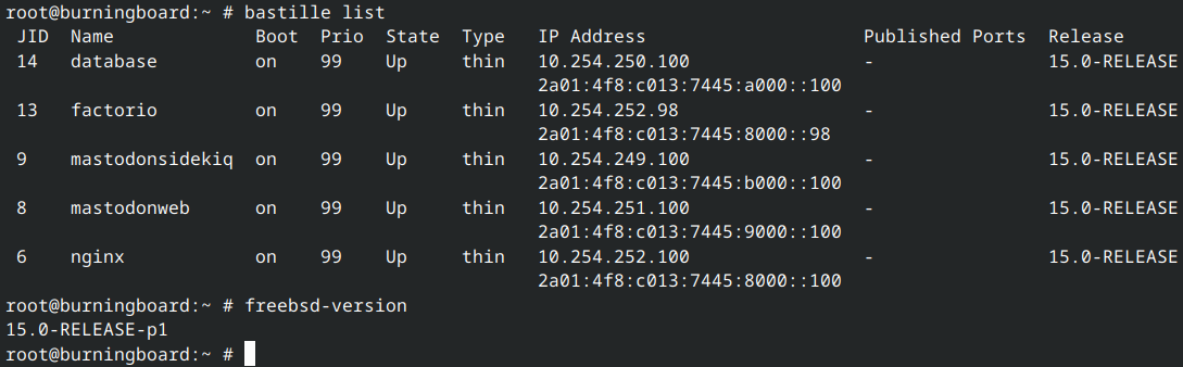 Did upgrade all the remaining service jails on our burningborad.net Mastodon instance to FreeBSD 15.0-RELEASE today, after the host was already upgraded one and a half week ago.
