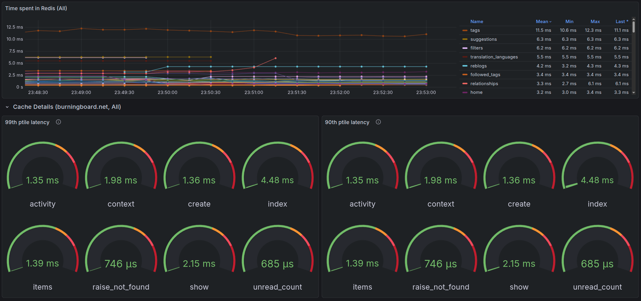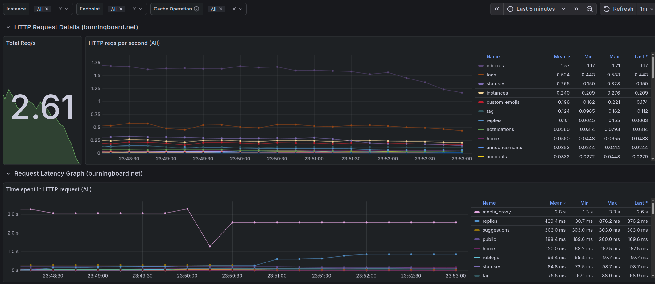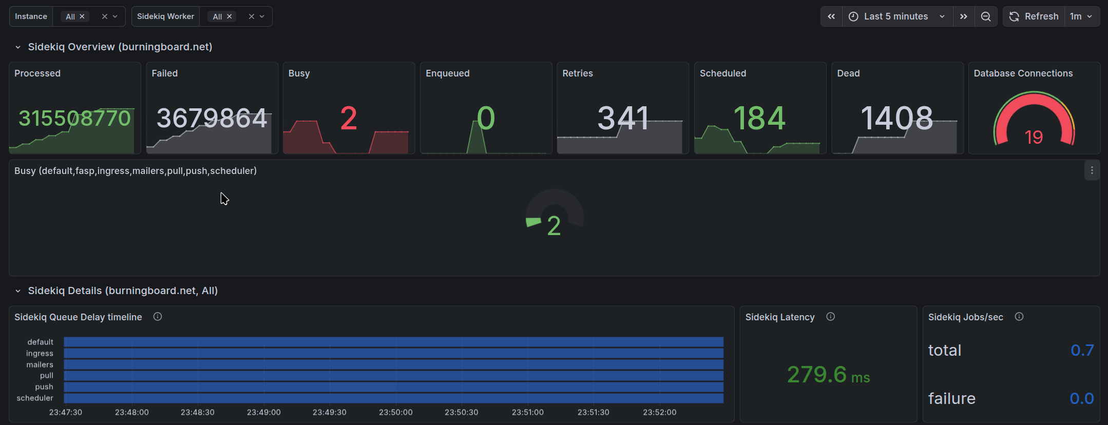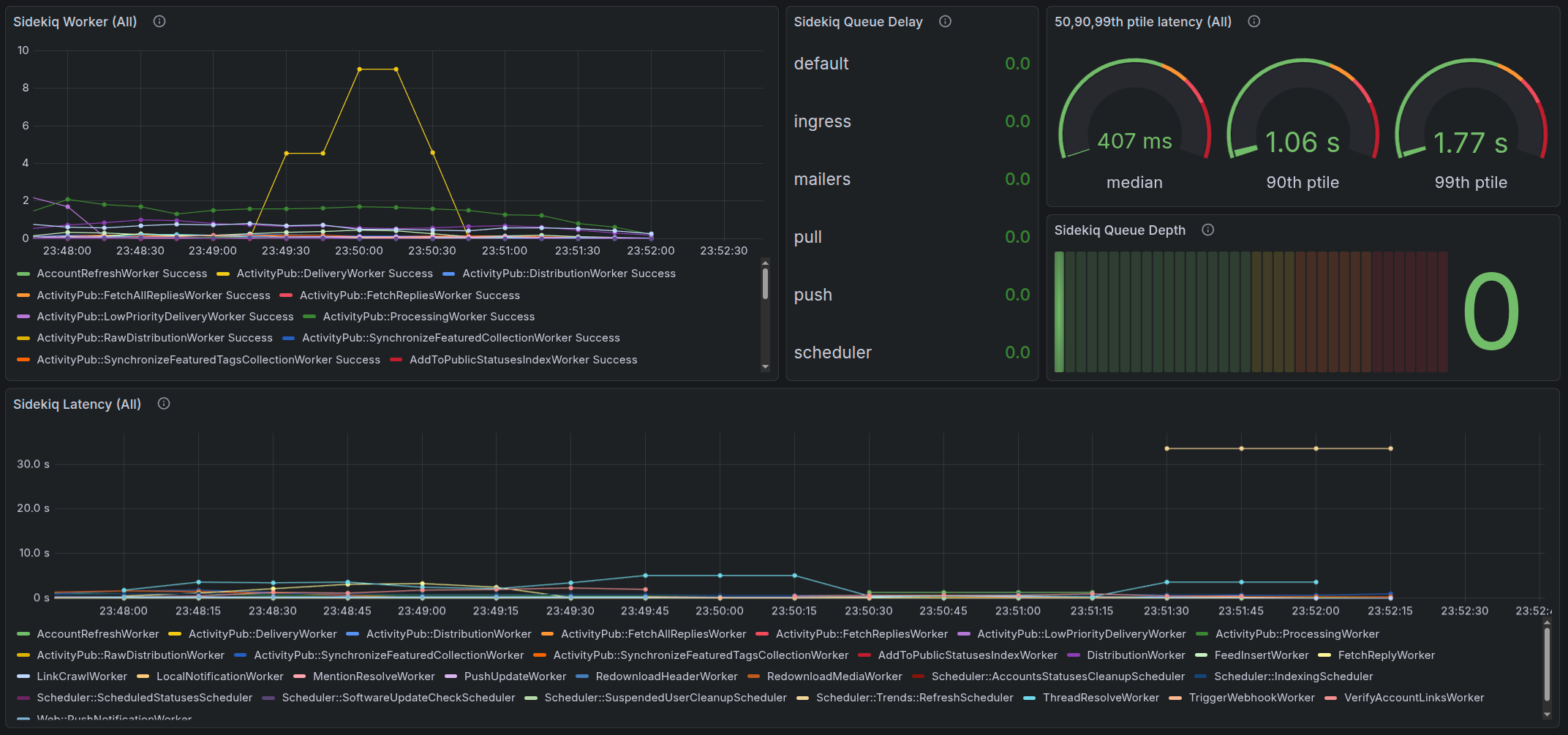 Did some proper Monitoring metric dashboards for our Mastodon instance today. Collecting insights from the Sidekiq and Puma processes. Long overdue ! (I pushed that task, since statsD was removed from Mastodon ...)