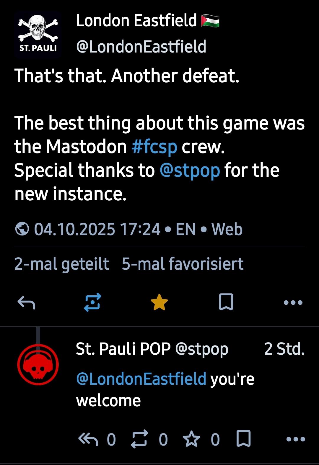 Glad to have you @LondonEastfield — #fcsp crowd, feel free to join https://stpauli.social and try #Mastodon from #Hamburg #stpauli