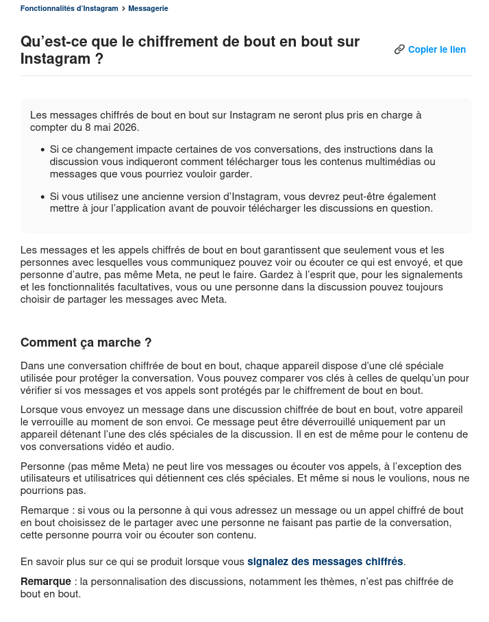 La page est marrante parce qu'après avoir écrit qu'ils arrêtent ça, ils expliquent les avantages du chiffrement de bout en bout. Dit autrement, "Voici tout ce que vous allez perdre à partir du 8 mai 2026."