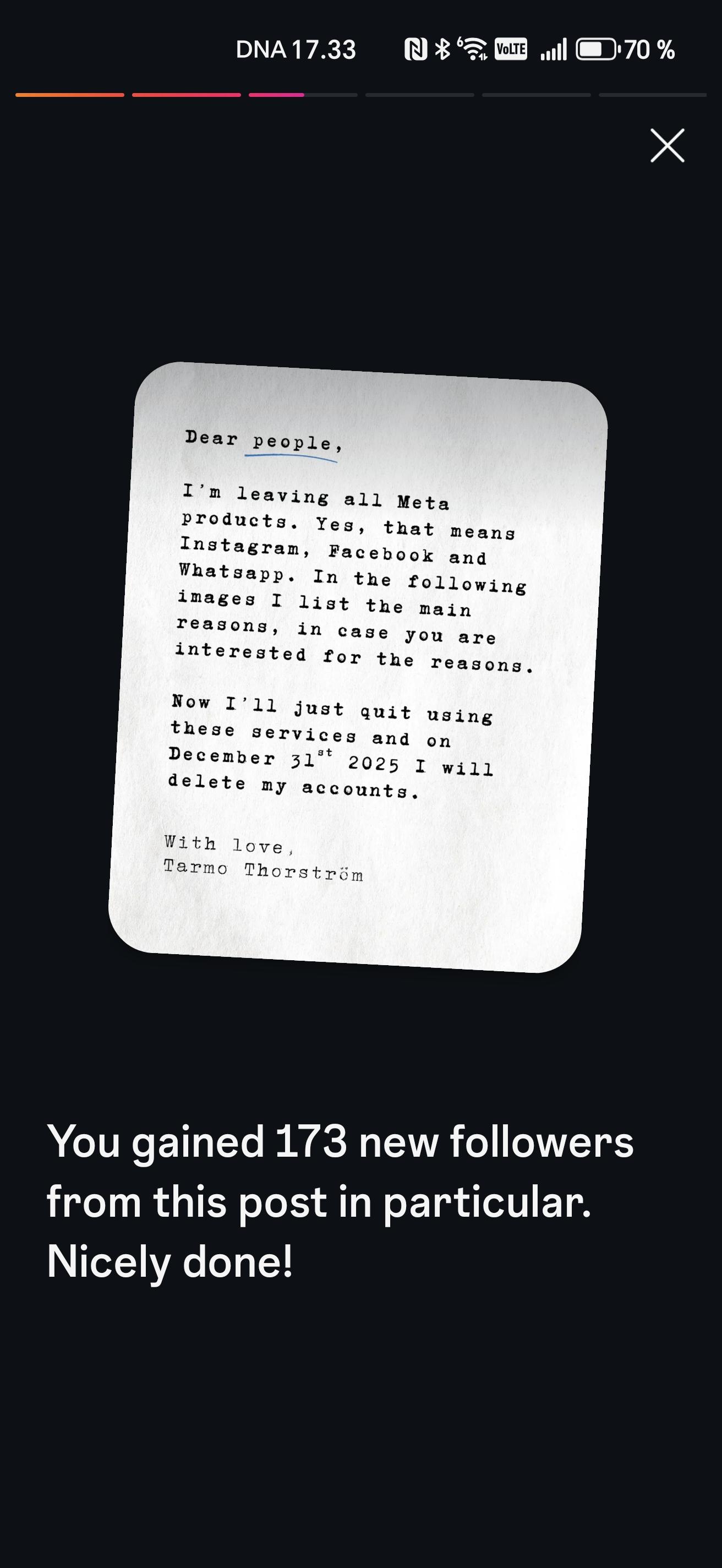 Syntymäpäiväni olen viettänyt pitkälti viestien ystävien, tuttavien ja sukulaisten kanssa siitä, miksi lopetan kaikkien Metan tuotteiden käytön. Viestiliikenne on sitä luokkaa, ettei tätä olisi ollut työpäivänä mahdollista tehdä. Ironista kyllä IG:n postaukseni tilieni lopettamisesta on ollut somehistoriani menestynein, monella tapaa: se on (paradoksaalisesti) tuonut uusia seuraajia mutta myös näkynyt useille tuntemattomille heidän fiidissään ensimmäisenä minun postauksena. Niin tai näin, huomenna kaikki Meta lähtee.