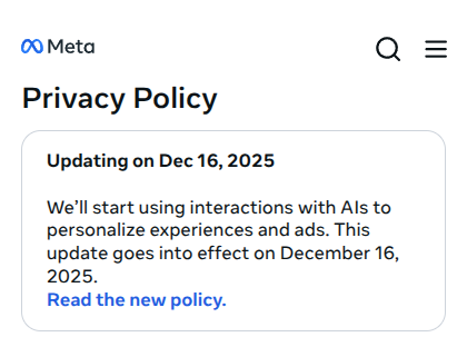 "Starting Dec. 16, Meta would harvest interactions between users and its suite of AI chatbots across Facebook, Instagram, and WhatsApp. These exchanges — meant to mimic casual, friendly conversations — would become training data for Meta’s algorithms and a new source of behavioral insight to fine-tune the ads users see."