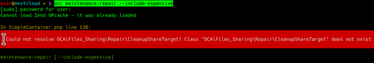 for some reason "occ maintenance:repair --include-expensive" fails, with the "File Sharing" App disabled.