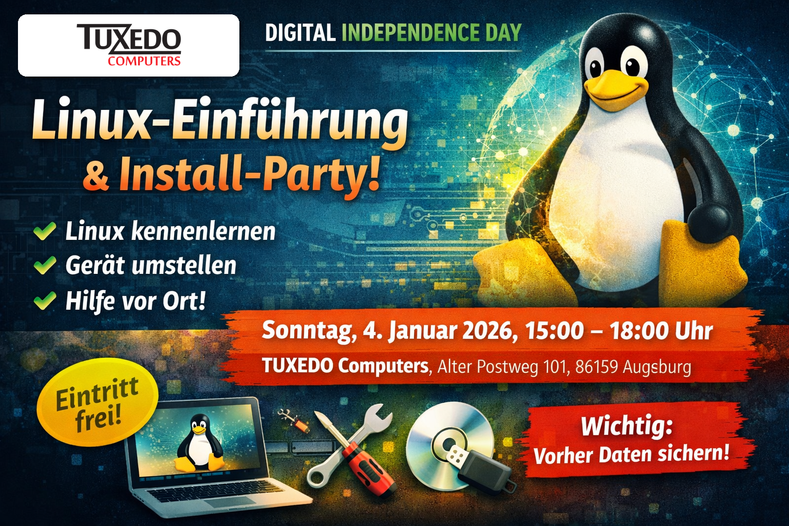 Mehr dazu unter: https://www.tuxedocomputers.com/de/Digital-Independence-Day-TUXEDO-Computers-laedt-zur-Linux-Einfuehrung-und-Install-Party-ein.tuxedo