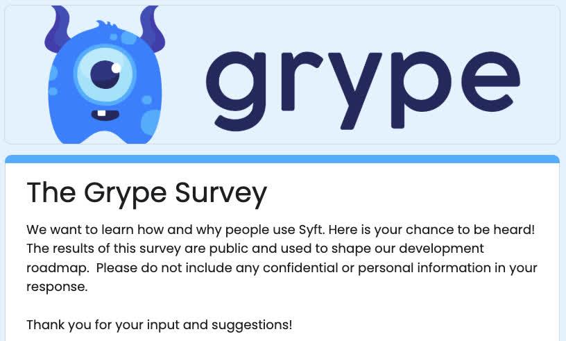 Want to influence the direction of Grype? 🚀 Tell us how you use it and what improvements you'd like to see! Your feedback matters! Survey here: https://forms.gle/hvgpNeZadLfFhCf69