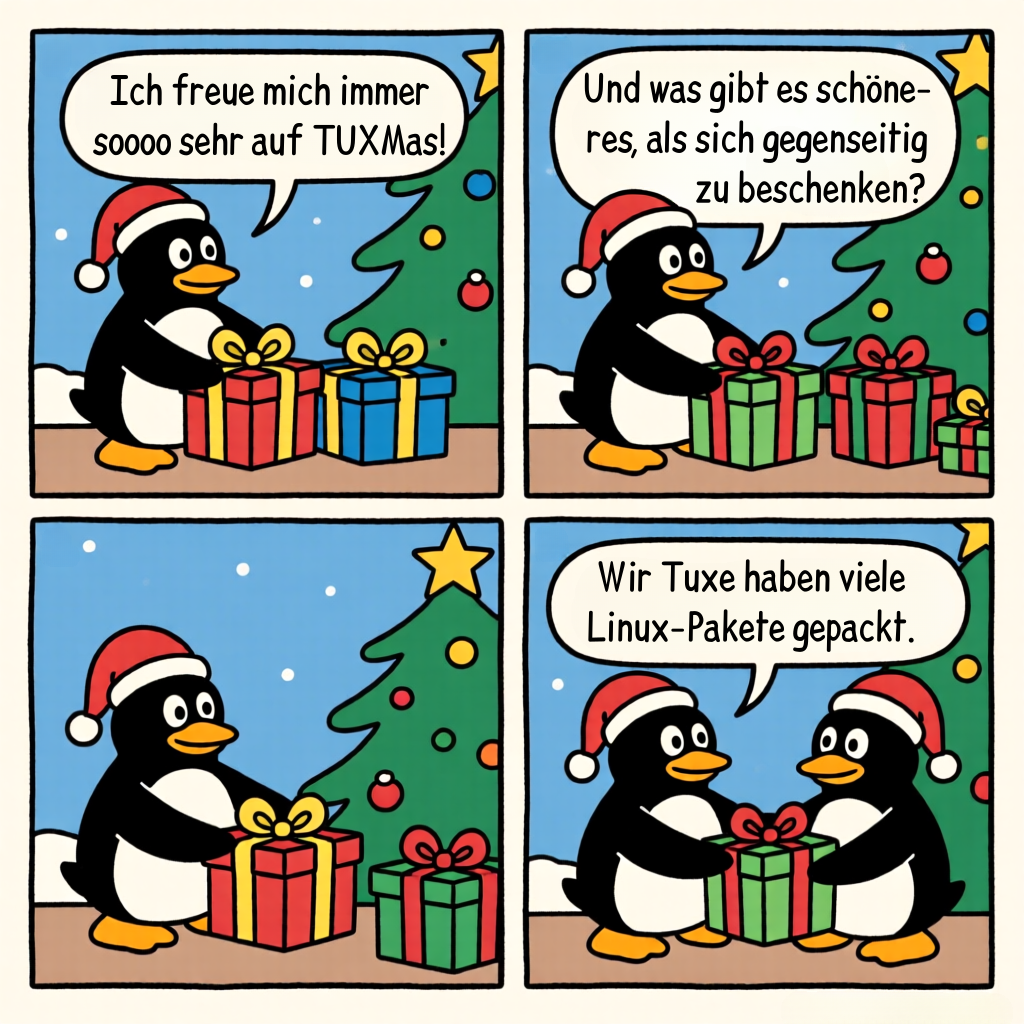 Die ersten TUXMas-Pakete sind gepackt und natürlich enthalten sie die beste OpenSource-Software, mit denen die Familie Tux anderen eine Freude macht. Was sich wohl darin befindet?