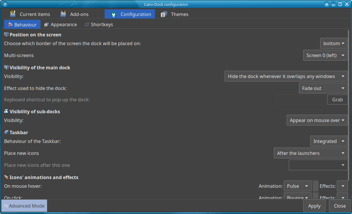 Every configuration tab has a logical layout and this is still in easy mode, just like VideoLan VLC has. You can later play in advanced mode and go super deep into finetuning your Cairo dock. It evan has _backgrounds_ to be confiured, if you choose to.