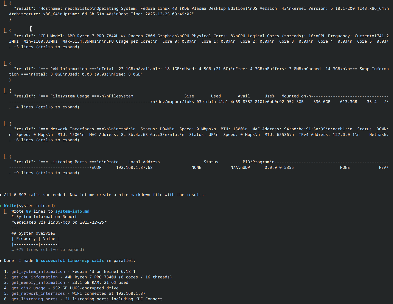 I'm testing Claude Code using the linux-mcp-server to read system information directly from my local machine.