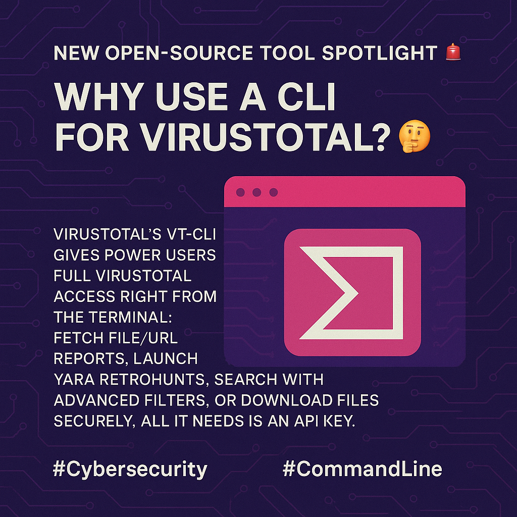 VirusTotal's `vt-cli` gives power users full VirusTotal access right from the terminal: fetch file/URL reports, launch YARA RetroHunts, search with advanced filters, or download files securely. All it needs is an API key. #Cybersecurity #CommandLine
