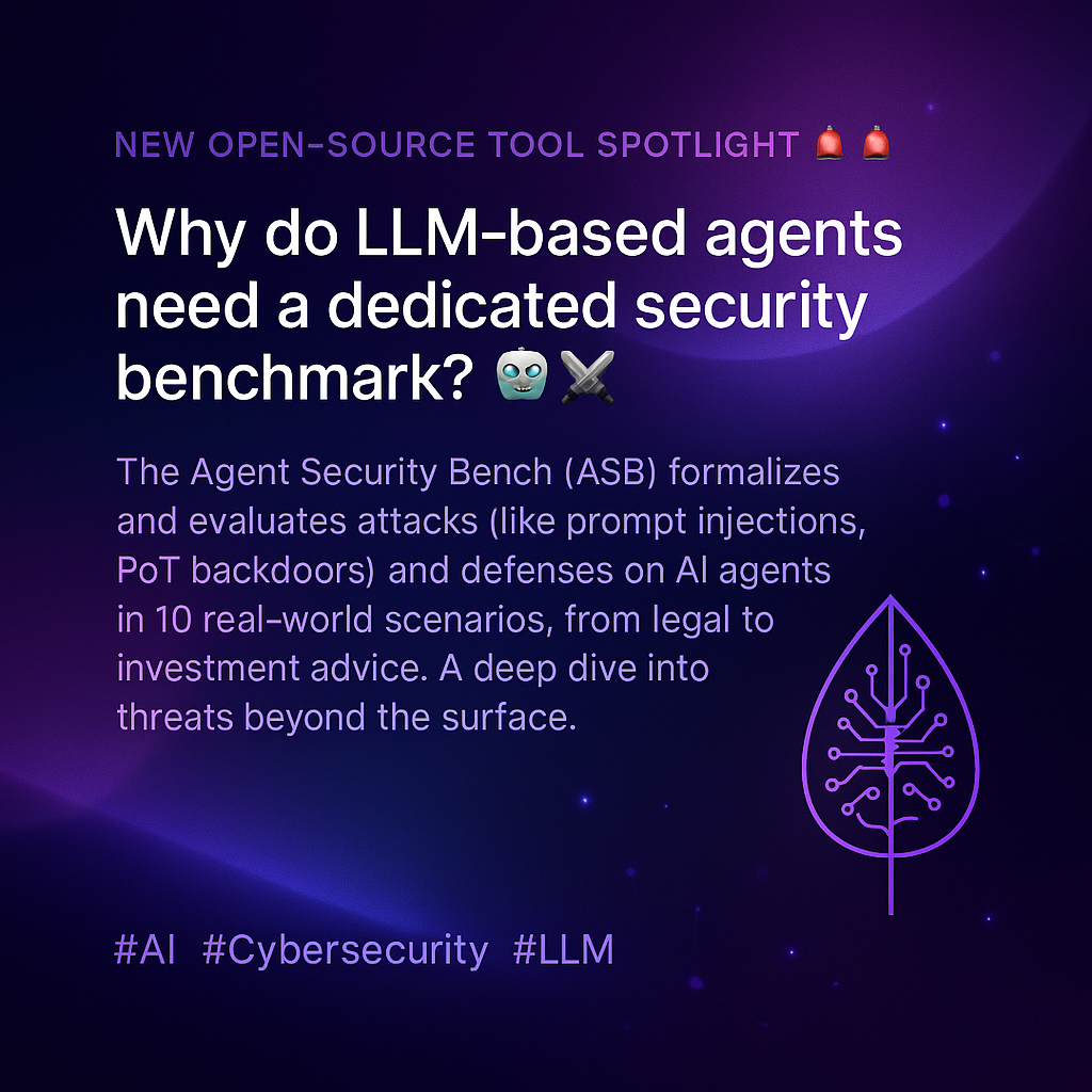 The Agent Security Bench (ASB) formalizes and evaluates attacks (like prompt injections, PoT backdoors) and defenses on AI agents in 10 real-world scenarios, from legal to investment advice. A deep dive into threats beyond the surface. #AI #Cybersecurity #LLM
