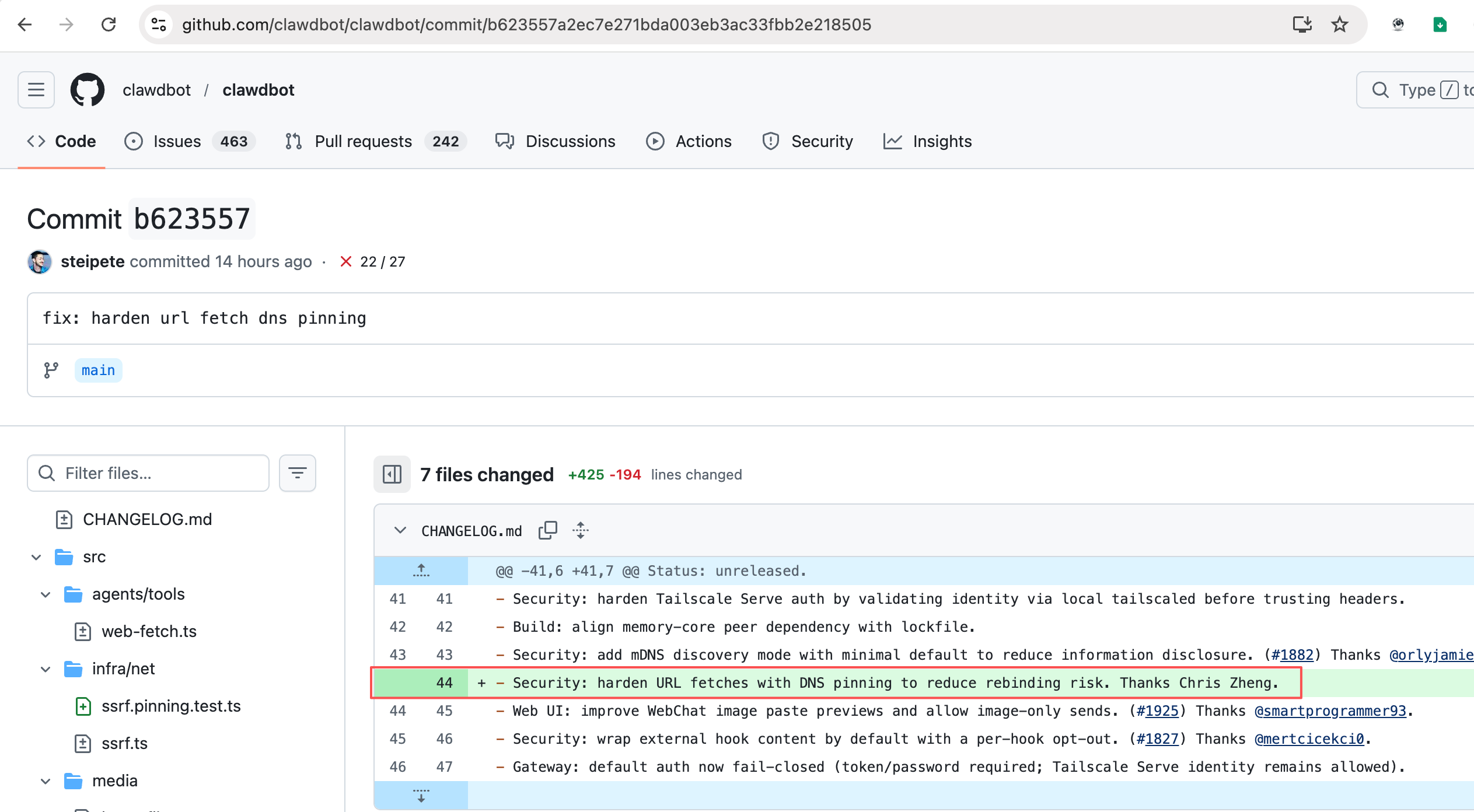The project has now implemented DNS Pinning to eliminate the vector. We are proud to be credited in the changelog for securing the ecosystem.