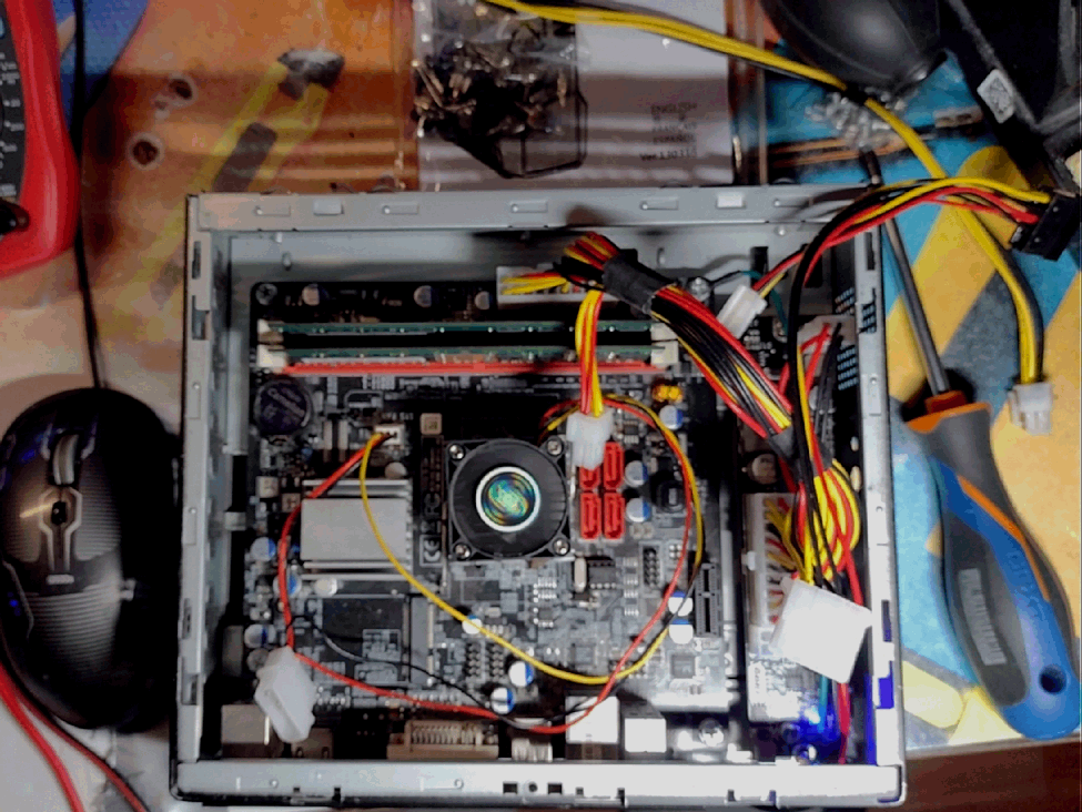 Motherboard: some Intel Atom motherboard with ITX formfactor and with 4 SATA interfaces, and gigabit Ethernet controller. PSU: some Chinese PSU which should emit 259W of power — enough for motherboard and 4 HDDs (I hope)