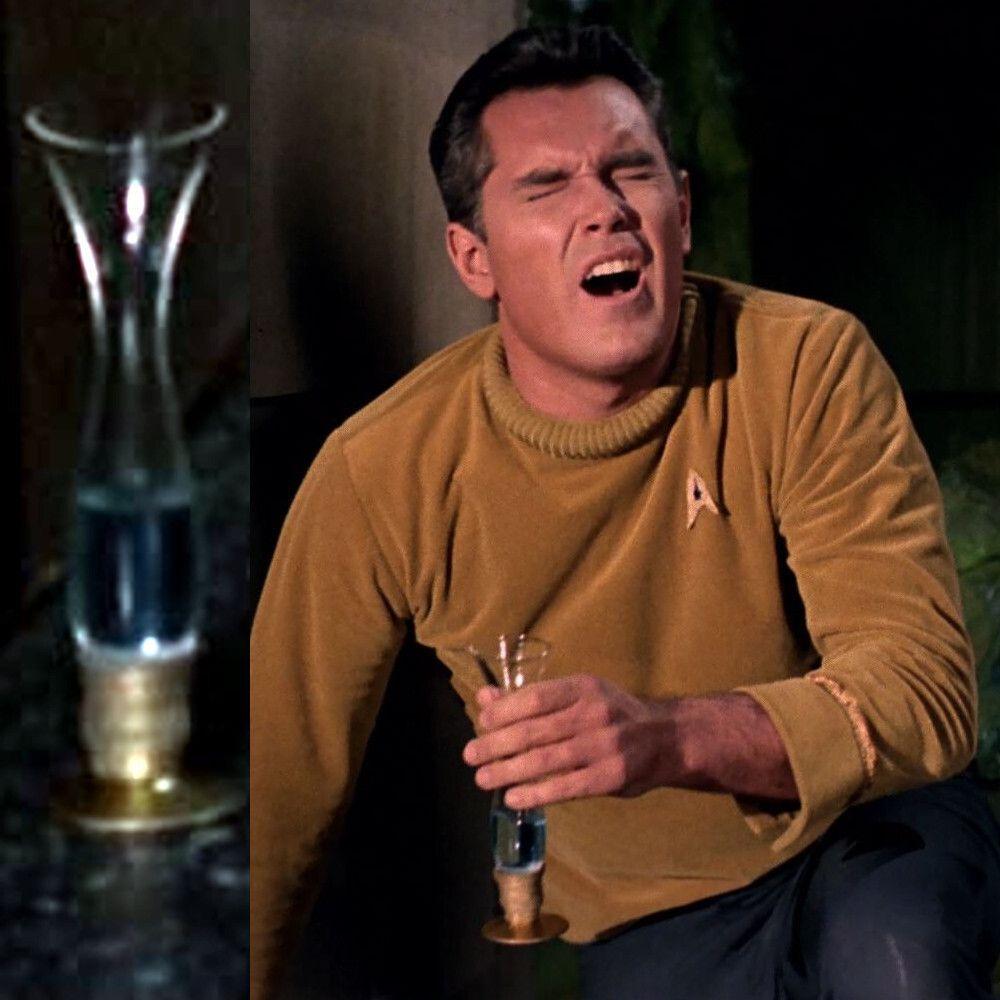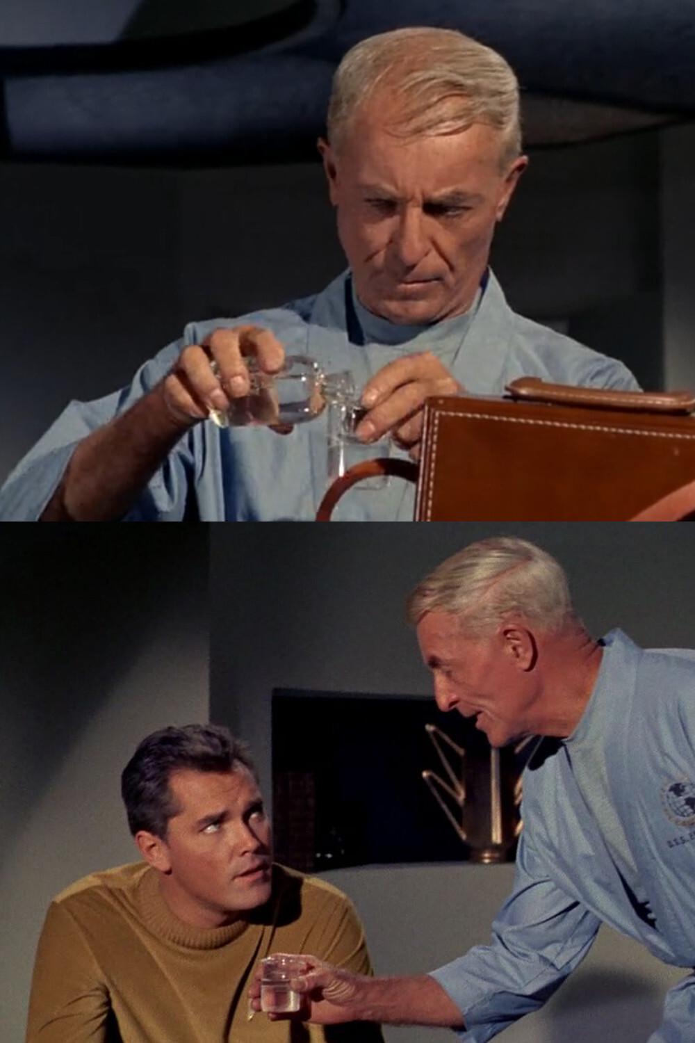 Before I start talking about food on #StarTrekTOS, I have to mention the very first drink/food ever seen on #StarTrek: The martini Dr. Boyce serves to Captaik Pike (in a beaker, no less) in the original pilot "The Cage". This is the only time a martini is seen without olives on the shows: 🧵 1/2