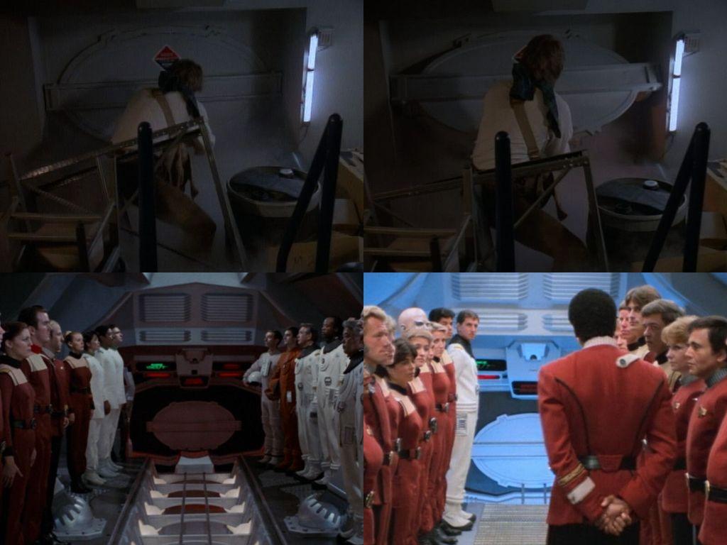 I found some familiar (most likely) vacuformed wall coverings in the subterranean lab in the #MacGyver pilot episode ⬅️➡️. These materials first appeared in various places in the early the #StarTrek films ↖️↗️ but later also appeared on various sets on #StarTrekTNG ("The Hunted"↙️↘️).